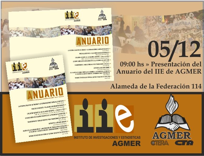 La Comisión Directiva Central y el Instituto de Investigaciones y Estadísticas (IIE) de AGMER presentarán este jueves 5 de diciembre el Anuario 2013, una publicación que reúne artículos de investigación en torno a las condiciones del trabajo docente, su construcción sindical y contexto político social.