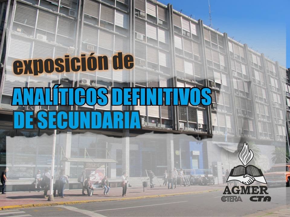Ante las desprolijidades que se pudieron constatar en el día de la fecha, con la puesta en marcha de la exposición on line de los analíticos definitivos de Nivel Secundario, la Comisión Directiva Central de AGMER exige al CGE, y su área informática, que cumpla con los plazos comprometidos y se eviten las anomalías, garantizando a los docentes del nivel la posibilidad de efectuar los reclamos que correspondan.